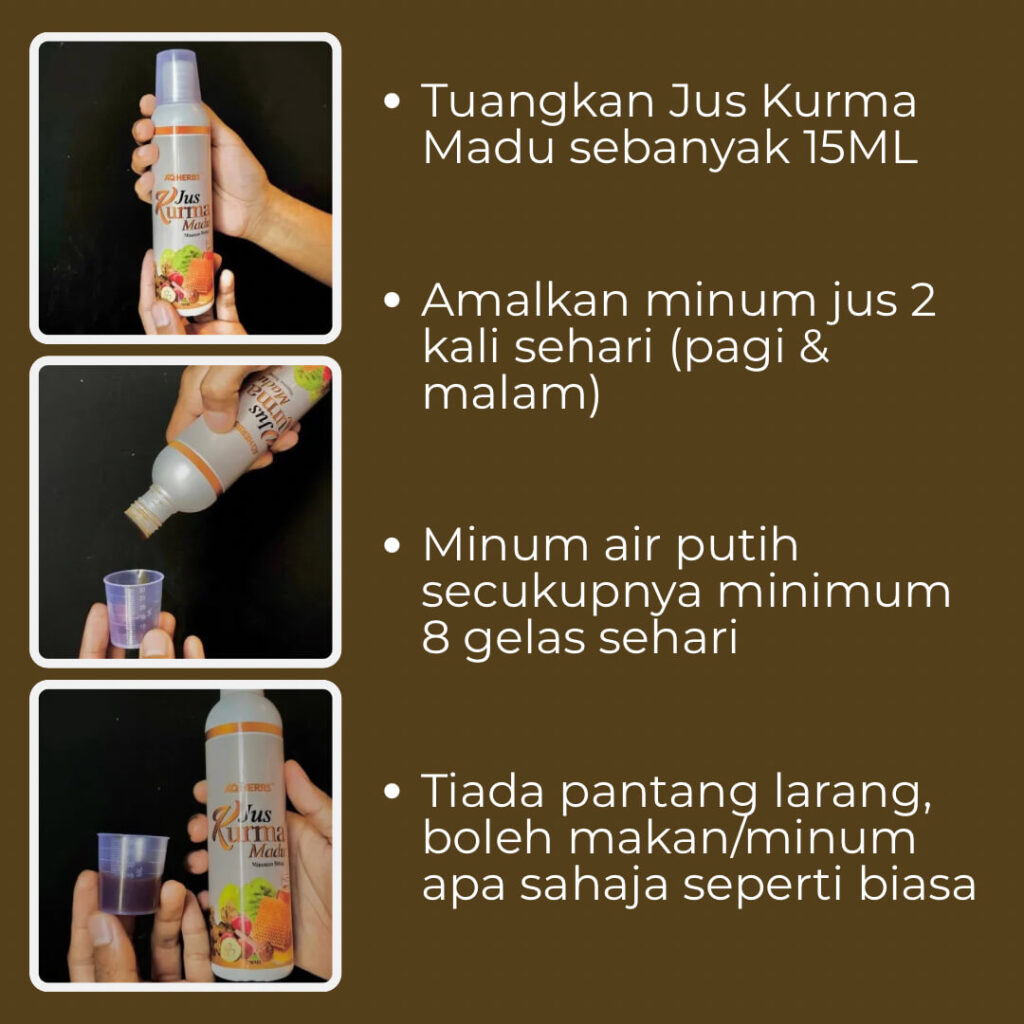 Jus Kurma Madu ialah ramuan khas berasaskan 6 herba semulajadi terpilih seperti Kunyit Hitam, Mengkudu, Misai Kucing, Mahkota Dewa, Kurma & Madu